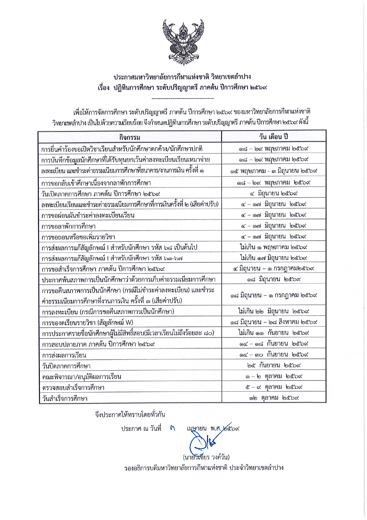 ปฏิทินการศึกษา ระดับปริญญาตรี ภาคต้น ปีการศึกษา 2569