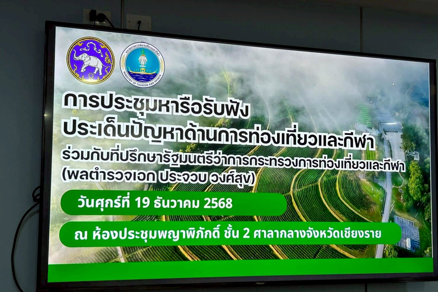วันศุกร์ที่ 19 ธันวาคม 2568 ดร.วิเชียร วงค์วัน รองอธิการบดีมหาวิทยาลัยการกีฬาแห่งชาติ ประจำวิทยาเขตลำปาง พร้อมด้วย สิบเอกวรเชษฐ์ หมัดอะดั้ม ผู้อำนวยการโรงเรียนกีฬาจังหวัดลำปาง เข้าร่วมการประชุมหารือและรับฟังประเด็นปัญหาด้านการท่องเที่ยวและกีฬา ร่วมกับ พลตำรวจเอกประจวบ วงศ์สุข ที่ปรึกษารัฐมนตรีว่าการกระทรวงการท่องเที่ยวและกีฬา การประชุมจัดขึ้น ณ ห้องประชุมพญาพิภักดิ์ ชั้น 2 ศาลากลางจังหวัดเชียงราย เพื่อแลกเปลี่ยนความคิดเห็น ข้อเสนอแนะ และแนวทางการพัฒนาด้านการท่องเที่ยวและกีฬาในพื้นที่ภาคเหนือให้มีประสิทธิภาพและสอดคล้องกับนโยบายของกระทรวง