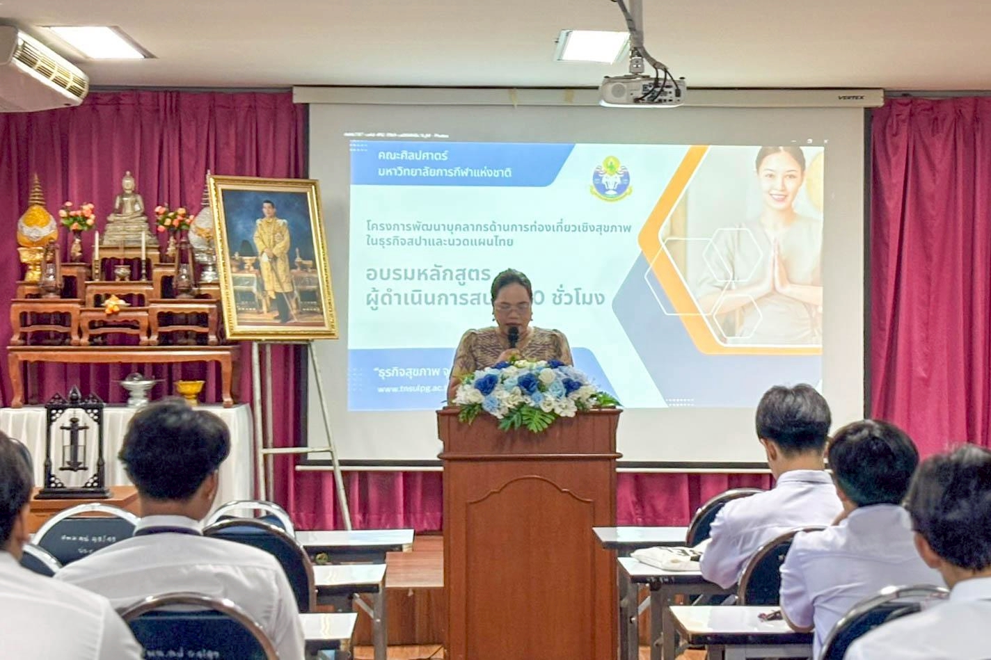 วันที่ 16 มิถุนายน 2568 มหาวิทยาลัยการกีฬาแห่งชาติ วิทยาเขตลำปาง ได้จัดพิธีเปิดโครงการพัฒนาสมรรถนะบุคลากรด้านการท่องเที่ยวเชิงสุขภาพในธุรกิจสปาและนวดแผนไทย และการอบรมหลักสูตรผู้ดำเนินการสปา 100 ชั่วโมง ประจำปีงบประมาณ 2568 โดยมีผู้ช่วยศาสตราจารย์ ดร.กาญจน์ศิริรักษา บุญเอี่ยม รองอธิการบดีมหาวิทยาลัยการกีฬาแห่งชาติ ประจำวิทยาเขตลำปาง เป็นประธานในพิธีเปิด และมีคณะผู้บริหาร คณาจารย์ และเจ้าหน้าที่ร่วมในงาน ได้แก่