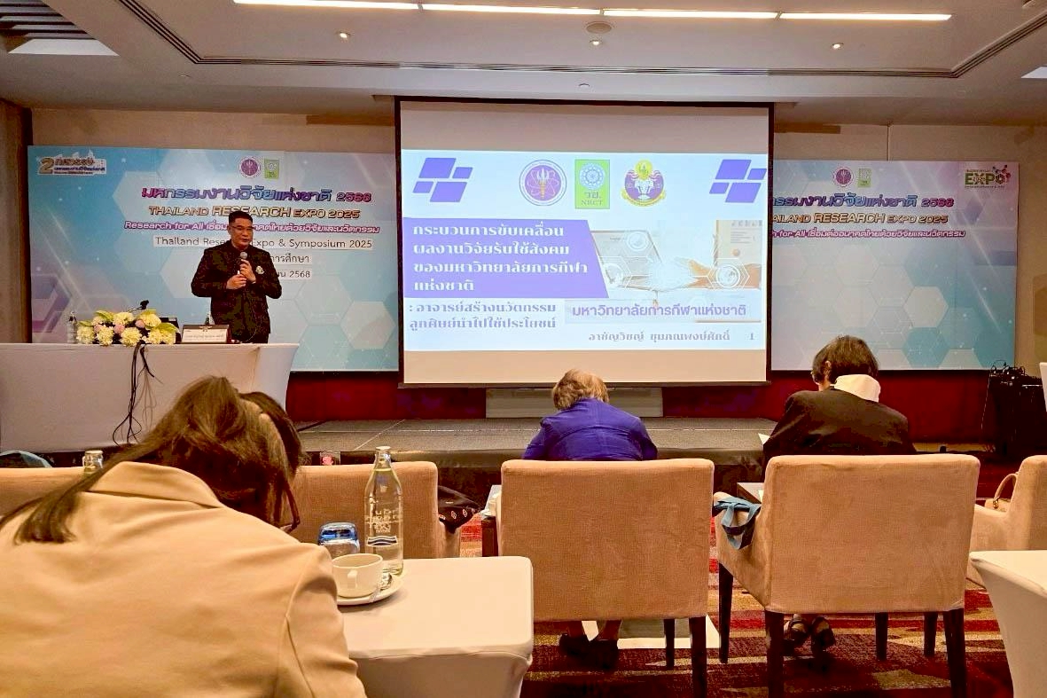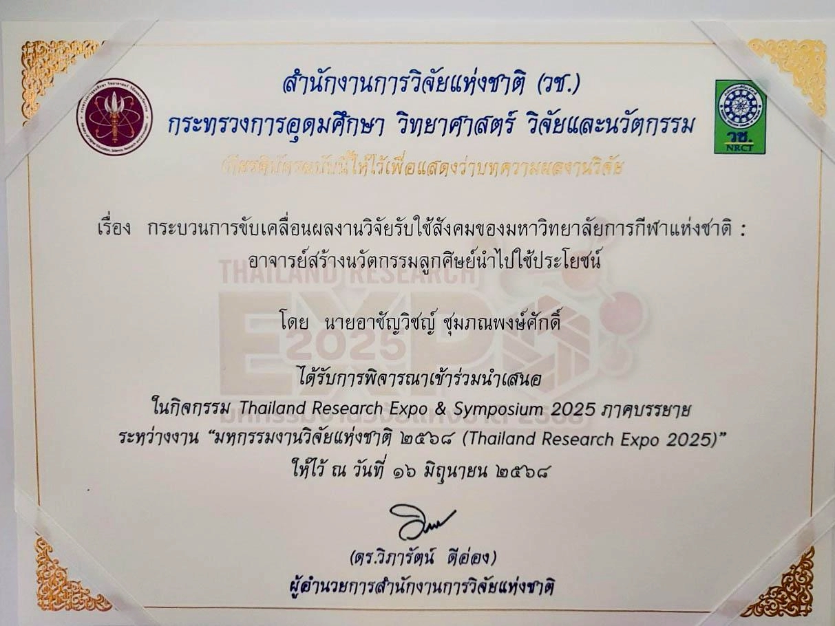 วันที่ 16 มิถุนายน 2568 ดร.อาชัญวิชญ์ ชุมภณพงษ์ศักดิ์ อาจารย์ประจำคณะศึกษา มหาวิทยาลัยการกีฬาแห่งชาติ วิทยาเขตลำปาง นำเสนองานวิจัยในหัวข้อ "กระบวนการขับเคลื่อนผลงานวิจัยรับใช้สังคมของมหาวิทยาลัยการกีฬาแห่งชาติ: อาจารย์สร้างนวัตกรรม ลูกศิษย์นำไปใช้ประโยชน์" ภายในงาน Thailand Research Expo & Symposium 2025 ซึ่งจัดขึ้นระหว่างวันที่ 16-20 มิถุนายน 2568 ณ โรงแรมเซ็นทาราแกรนด์ และบางกอกคอนเวนชันเซ็นเตอร์ เซ็นทรัลเวิลด์ กรุงเทพฯ งานครั้งนี้มีวัตถุประสงค์เพื่อเป็นเวทีระดับชาติ สำหรับการนำเสนอความก้าวหน้าด้านผลงานวิจัย เทคโนโลยี และนวัตกรรม พร้อมทั้งการเชื่อมโยงและบูรณาการองค์ความรู้ไปสู่การใช้ประโยชน์ในการพัฒนาประเทศในทุกมิติ โดยมีนิทรรศการผลงานวิจัยและนวัตกรรมกว่า 500 ผลงาน และการประชุมสัมมนากว่า 100 หัวข้อ