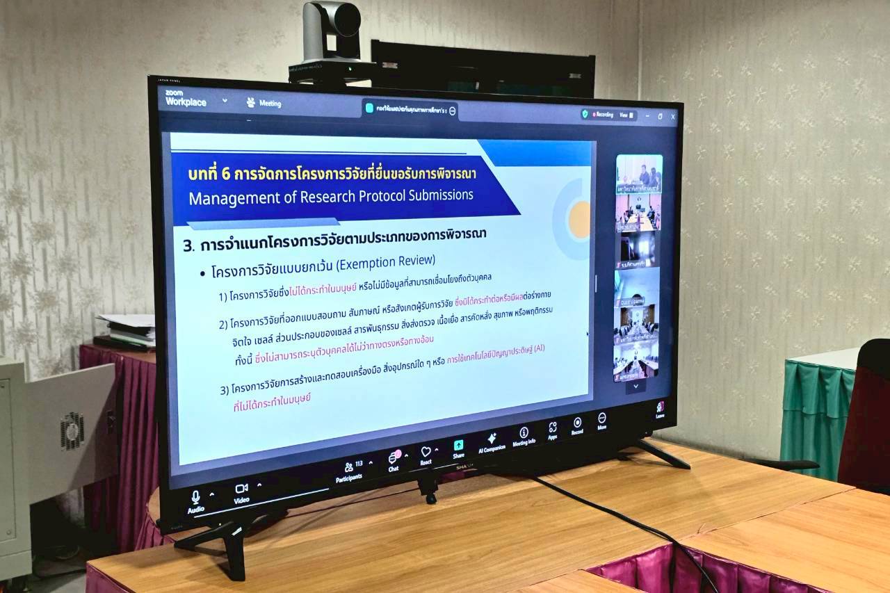 วันที่ 13 พฤศจิกายน 2568 มหาวิทยาลัยการกีฬาแห่งชาติ วิทยาเขตลำปาง เข้าร่วมการประชุมคณะกรรมการพิจารณาจริยธรรมการวิจัยในมนุษย์ มหาวิทยาลัยการกีฬาแห่งชาติ (มกช.) ผ่านระบบการประชุมทางไกล (Video Conference) เพื่อร่วมพิจารณาและให้ความเห็นชอบ วิธีดำเนินการมาตรฐานและแบบฟอร์มวิธีดำเนินการมาตรฐาน (Standard Operating Procedures: SOPs) ฉบับที่ 3 พ.ศ. 2568 โดยมีวัตถุประสงค์เพื่อยกระดับและกำหนดแนวทางการดำเนินงานด้านจริยธรรมการวิจัยในมนุษย์ของมหาวิทยาลัยฯ ให้มีความถูกต้อง โปร่งใส และเป็นไปตามหลักเกณฑ์สากล เพื่อให้การดำเนินงานวิจัยในสังกัดมหาวิทยาลัยฯ มีคุณภาพ เป็นไปตามมาตรฐานจริยธรรม และน่าเชื่อถือในระดับวิชาการต่อไป